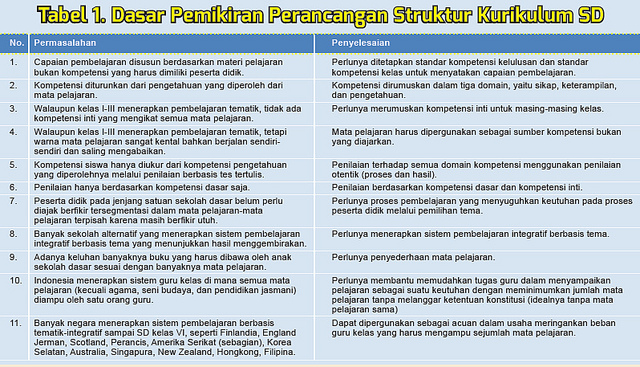 Pada titik inilah, maka penyampaian struktur kurikulum dalam uji publik ini menjadi penting. Tabel 1 menunjukkan dasar pemikiran perancangan struktur kurikulum SD, minimal ada sebelas item. Sementara dalam rancangan struktur kurikulum SD ada tiga alternatif yang di mesti kita berikan masukan.
